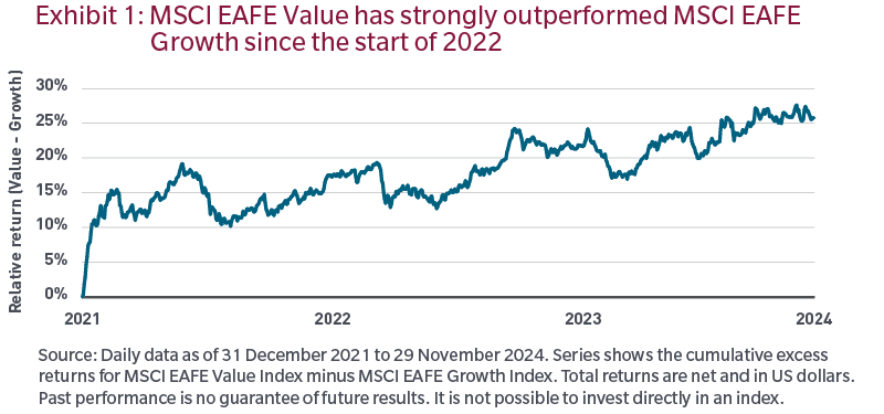 - While US equities, most notably technology and growth stocks, have been in favor for well over a decade, history has shown that market leadership alternates between US and non-US stocks. Similarly, sometimes growth predominates, sometimes value, and there may in fact currently be a shift underway in international markets as international value has strongly outperformed international growth since the onset of interest rate hikes in early 2022 (Exhibit 1).