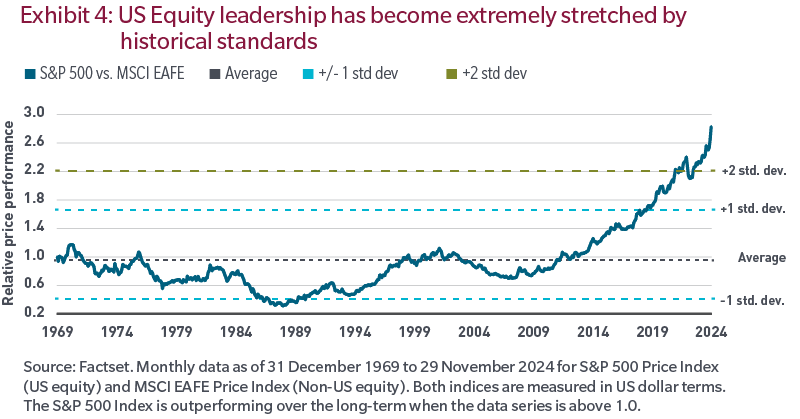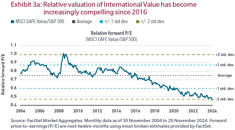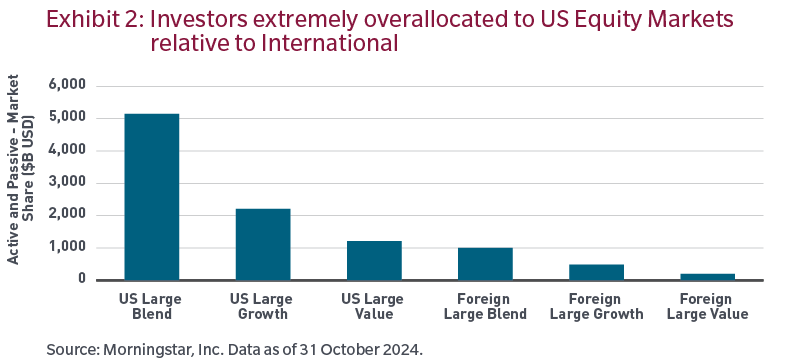 For well over a decade, a backdrop of declining interest rates and inflation expectations led investors to favor long-duration growth equities above all, dismissing the long-term benefits of diversification. With its technology-heavy orientation, the US market, using the S&P 500 Index as a proxy, generated an annualized return of 14.2% over the past 15 years through November 2024. The S&P 500 technology sector, which makes up 30% of the S&P 500 Index today, generated an annualized 20.2%. On the other hand, the MSCI EAFE Value Index, with its meaningful weights to out-of-favor areas of the market such as banks, metals and mining companies, and major oil companies, returned a paltry 4.5%. Not surprisingly, over this period we witnessed a surge in allocations to the growth-centric US market, leaving international asset classes in the dust, in particular the international large-cap value asset class (Exhibit 2).