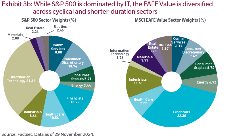 With that as the backdrop, what happened after the dot-com bubble is where we want to focus, as it will be the environment over the next ten years, not the last ten, that will drive investor returns. Over the 2000s business cycle, from March of 2001 through December 2007, the MSCI EAFE Value Index generated an annualized return of 10.9%. This was nearly three times the return of the S&P 500, which generated a return of 4.1%, with its technology sector generating a return of 0.35% over that same period. While the 31% drop of the S&P 500’s price-to-earnings ratio over this period was a large driver of poor US market returns, this is not what drove the international value market’s nearly 11% annualized return as it was driven entirely by earnings and dividends. In this context, it’s important to set the stage by comparing the market structure of the S&P 500 and the MSCI EAFE Value Index, as the two could not be more different. Perhaps the most notable difference — besides valuations now trading over two standard deviations “cheap” relative to the S&P 500 — is the EAFE Value Index, through exposure to cyclical and shorter-duration sectors such as financials, materials, industrials and energy, presents a much more diversified universe when compared to the tech-laden S&P 500 (Exhibits 3a and 3b). This is important in that, while technology remains a vibrant investment opportunity, we believe a much broader subset of sectors and industries appear well positioned to benefit from future earnings trends.