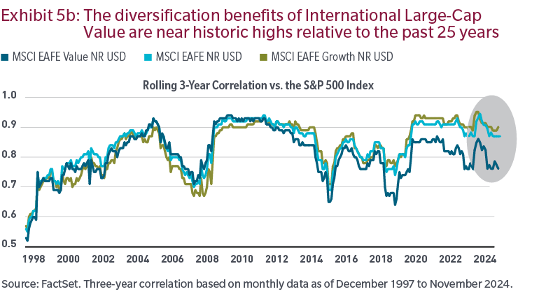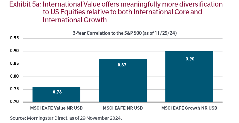 For long-term investors an allocation to the international value asset class can be a great diversifier to US exposure in an equity portfolio. While the historical benefits of diversification are well known among the investing community, not only does the international value asset class offer more diversification today for US investors, even when compared to both the international core and international growth asset classes, that level of diversification, when looked at through the lens of correlations, is at or near the widest levels we’ve witnessed historically (Exhibits 5a and 5b).